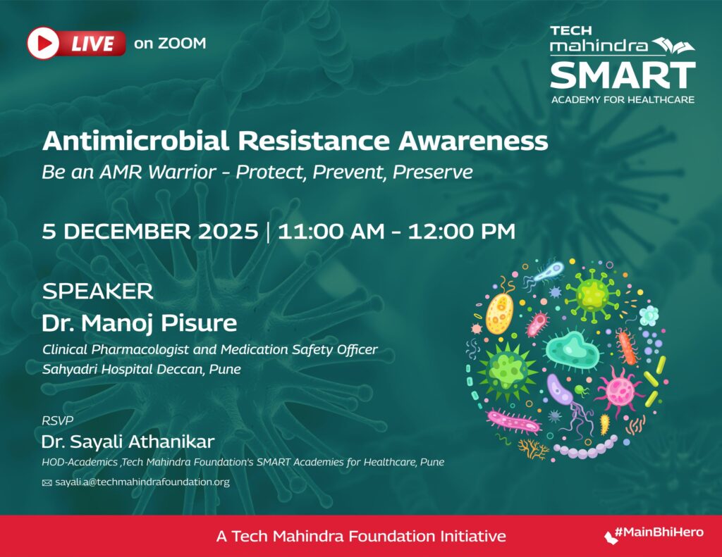 हमारी SMART हेल्थकेयर अकैडमी, पुणे पर एक वेबिनार आयोजित कर रहा है Antimicrobial Resistance Awareness - “Be an AMR Warrior – Protect, Prevent, Preserve” with Dr Manoj Pisure, Clinical Pharmacologist and Medication Safety Officer at Sahyadri Hospital Deccan,Pune. This webinar will provide a scientific and practical look at antimicrobial resistance (AMR), exploring how it develops, why it threatens global health, and what innovative strategies can curb its spread. It will also emphasize the crucial roles that healthcare professionals, policymakers, and communities play in protecting antibiotics, preventing infections, and preserving the effectiveness of life-saving treatments for future generations—empowering everyone to become an AMR Warrior.